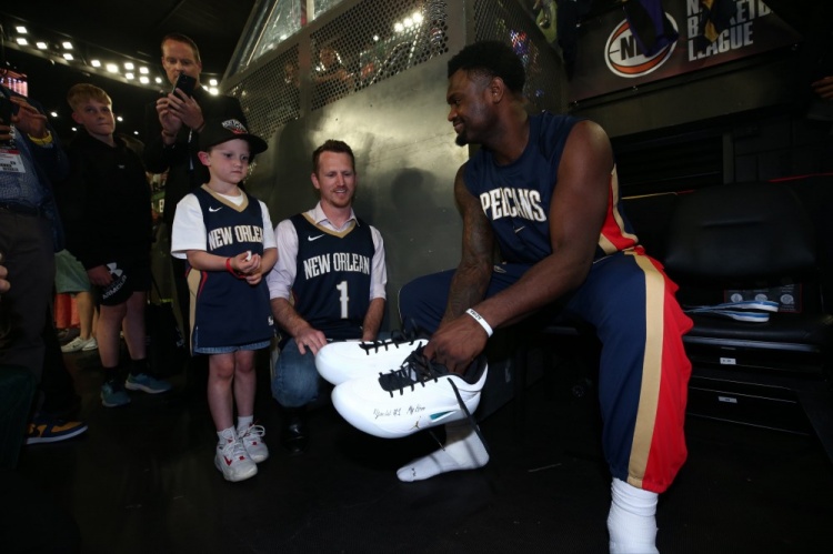 10月6日讯 在澳大利亚进行季前赛的锡安,在比赛中将自己亲穿球鞋签名送给了一位小球迷Theodore。Theodore刚刚战胜了癌症。