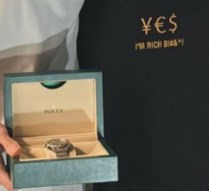 在两人的合照中,申京衣服上印着三种货币符号,分别是日元/人民币、欧元与美元,下方还写着“我很富”的字样。
