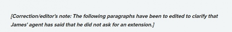 该记者随后在文章中写上更正/注释,具体为:“本文内容已经修改,詹姆斯的经纪人说过,他没有向湖人要求提前续约。”