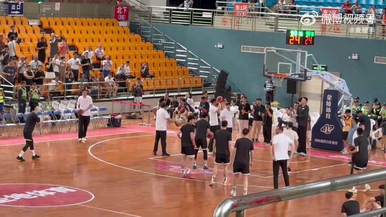赛前热身环节,胡明轩率领众广东队员进行投篮热身。