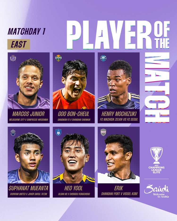 东亚区方面,攻破三支中超球队申花、蓉城和海港球门的三名球员具本哲(江原FC)、许律(蔚山现代)和埃里克-利马(神户胜利船)入围;西亚区方面,特奥、塔迪奇、恩佐-米洛入围。具体如下: