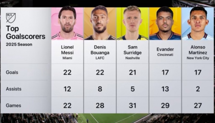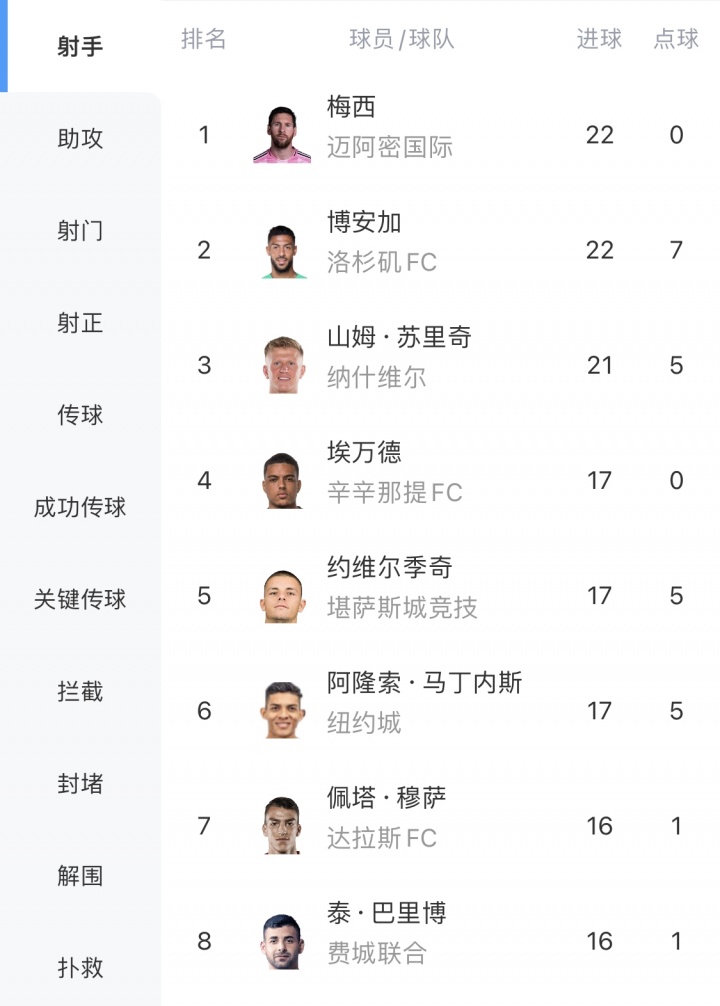 美职联比赛,洛杉矶FC4-1大胜皇家盐湖城,博安加戴帽,射手榜上22球追平梅西。不过根据比赛场次数据而言,梅西是所有球员中效率最高者。