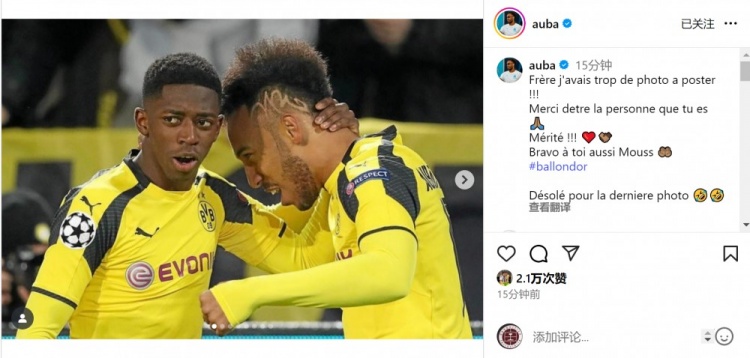 奥巴梅扬社媒晒出与登贝莱效力多特、巴萨时期的多张合照,配文:“兄弟,我有太多照片要发了!感谢你成为现在的自己🙏🏽实至名归❤️🤝🏽也恭喜你,穆斯 (登贝莱好友)🤲🏽抱歉发了最后一张照片🤣🤣”