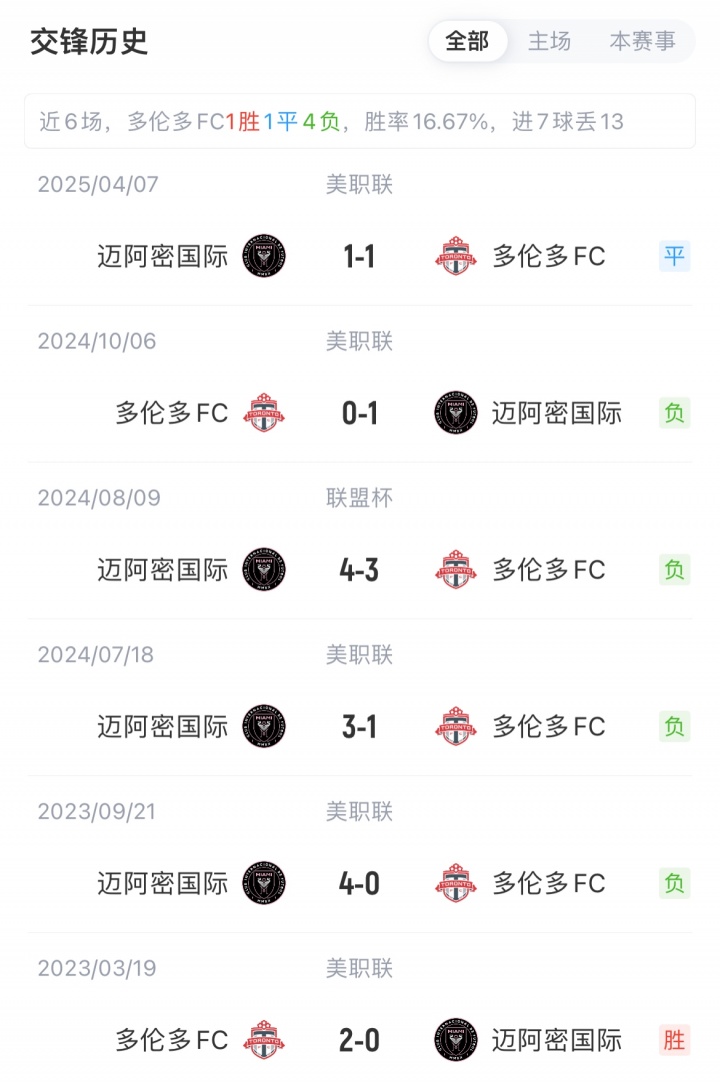 积分榜方面,迈阿密国际16胜7平6负积55分,近期收获3连胜;多伦多FC5胜12平13负积27分,近8轮不胜且收获6连平。迈阿密国际历史对阵多轮多FC已5场不败(4胜1平)。