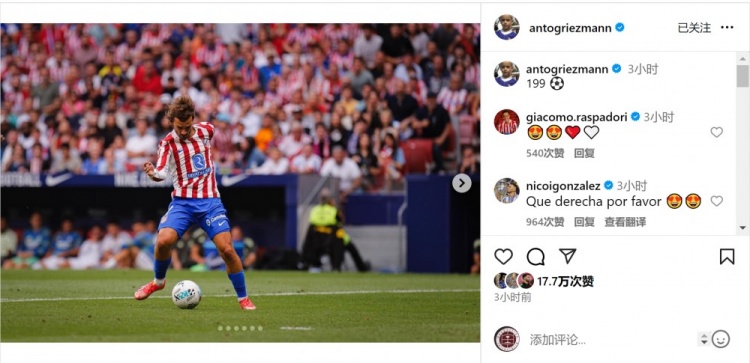 格列兹曼为马竞攻入199球,在西甲比赛中打进199球,仅差1球达成200球里程碑,赛后他在社交媒体上晒出比赛照片,配文:“199⚽️