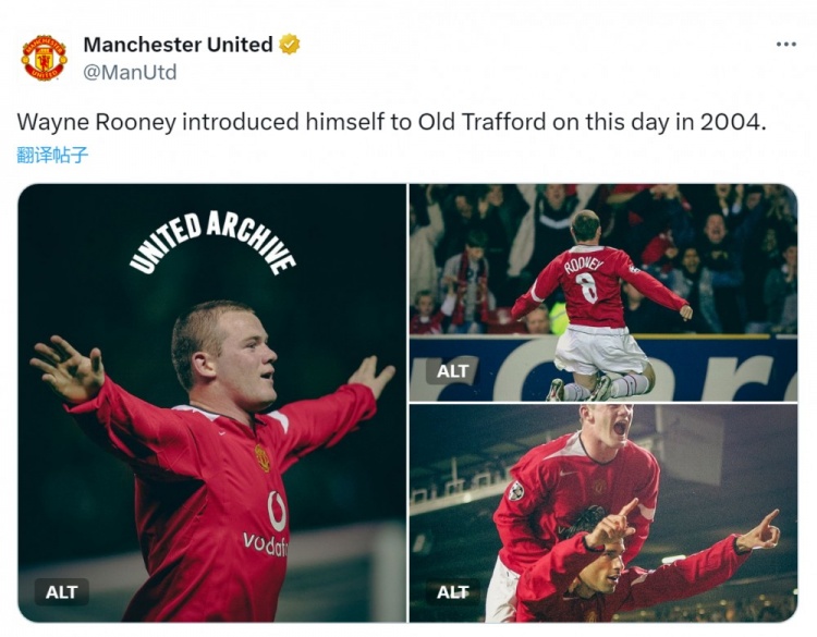 曼联官方社媒晒出鲁尼首秀的照片,回顾那令人难忘的一天。