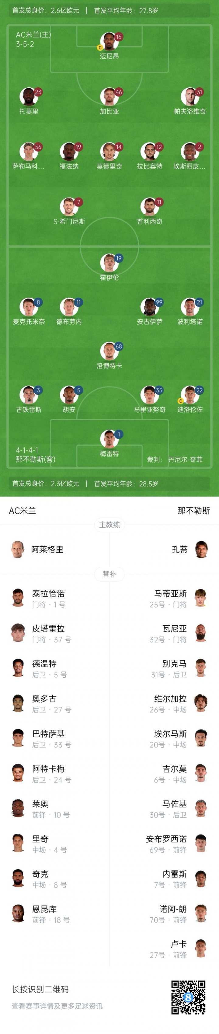 那不勒斯替补:25-马蒂亚斯·费兰特、32-瓦尼亚·米林科维奇、31-别克马、26-维尔加拉、20-埃尔马斯、6-吉尔莫、30-马佐基、69-安布罗西诺、7-内雷斯、70-诺阿·朗、27-洛伦佐·卢卡