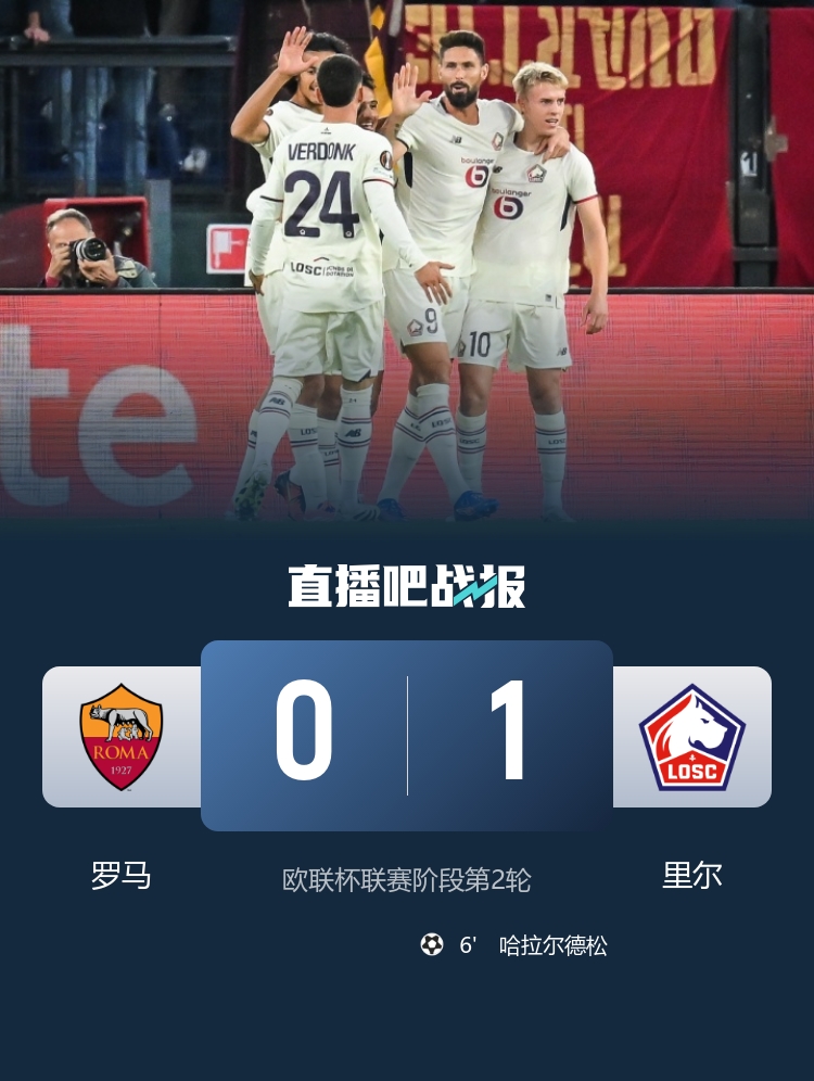 第6分钟,齐米卡斯后场失误被断,哈拉尔德松破门,里尔1-0领先罗马↓