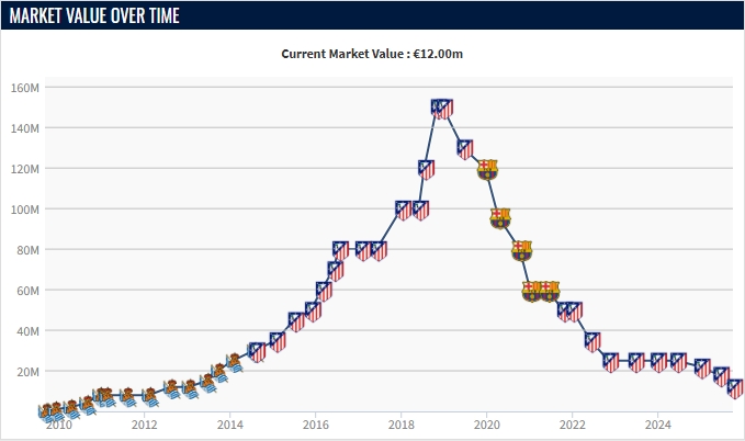 巅峰时期的格列兹曼,作为法国队的核心之一,帮助球队斩获世界杯冠军。2018年年末,27岁的格子达到了最高身价1.5亿欧。比较遗憾的是,格列兹曼后来加盟巴萨的经历并不美好,他还刚好错过了2次西甲冠军,至今没有斩获联赛冠军。