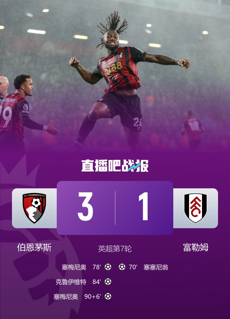 塞梅尼奥一条龙+双响,伯恩茅斯主场3-1逆转富勒姆,英超6轮不败!