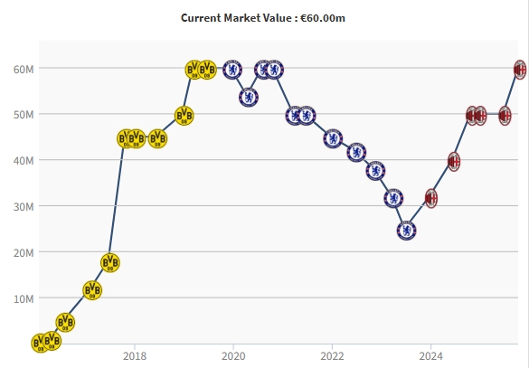普利西奇曾在2019、2020年效力多特和切尔西时期身价达到6000万欧,此后一路下跌至2500万欧。