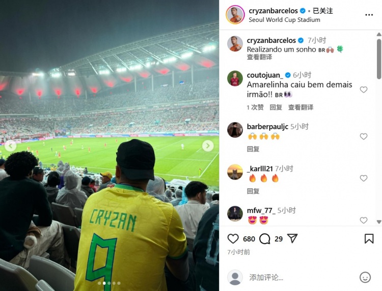 身穿自己名字的巴西9号球衣!克雷桑现场观战巴西vs韩国