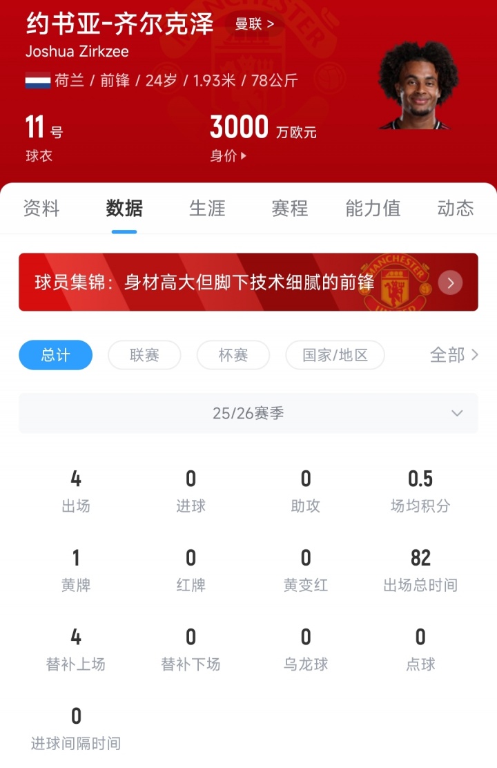 2024年夏窗,时任曼联主帅滕哈赫花费4250万欧元,从博洛尼亚签下了自己的荷兰老乡齐尔克泽。加盟曼联至今,齐尔克泽共代表球队出战53场比赛,贡献7粒进球和3次助攻,目前24岁的齐尔克泽德转身价为3000万欧元。