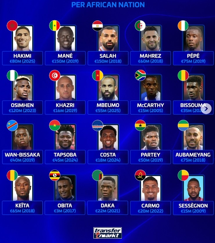 德转非洲各国历史身价最高球员:萨拉赫、马内1.5亿欧并列榜首
